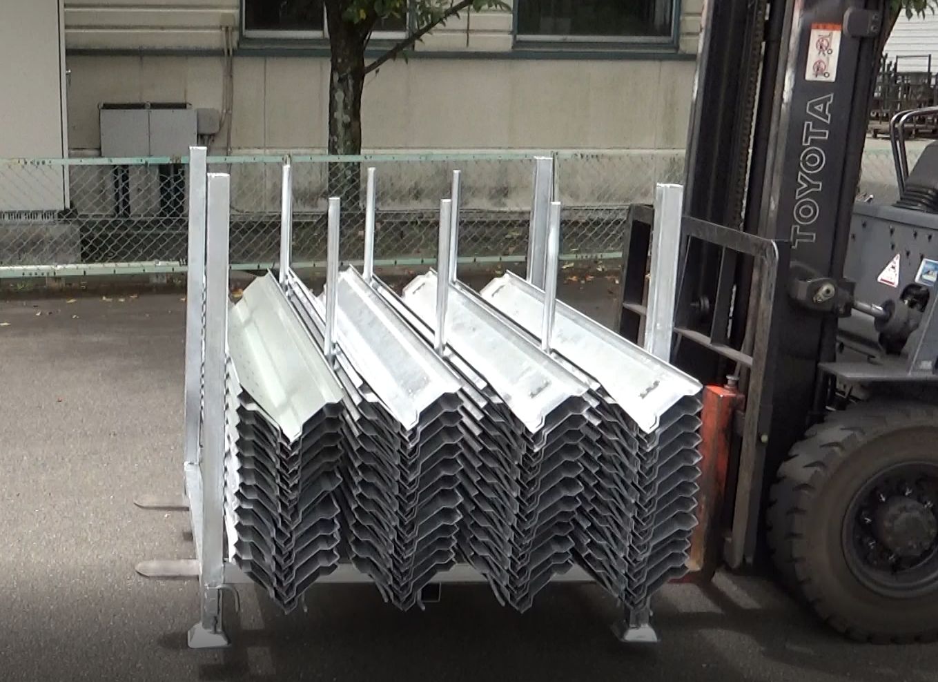 足場用鋼製L型巾木をまとめて倉庫やヤードで段積みで保管でき、現場へトラックでまとめて運搬する際に使用できます。